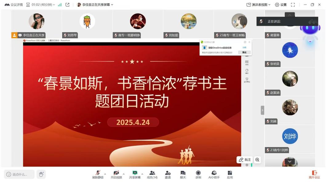 活动中,各班团支书立足专业特色与实践感悟,化身“荐书使者”,围绕不同书籍的核心内容与思想内核,分享阅读带来的成长蜕变。随后,荐书环节正式拉开帷幕,同学们以小组为单位依次展示,通过精心制作的PPT、生动有趣的视频或是声情并茂的讲述,向大家推荐自己心中的宝藏书籍。在荐书环节结束后,活动进入了互动交流阶段,同学们围绕所推荐的书籍展开了热烈讨论,大家各抒己见,最终评选出了各班的“最佳推书小组”。