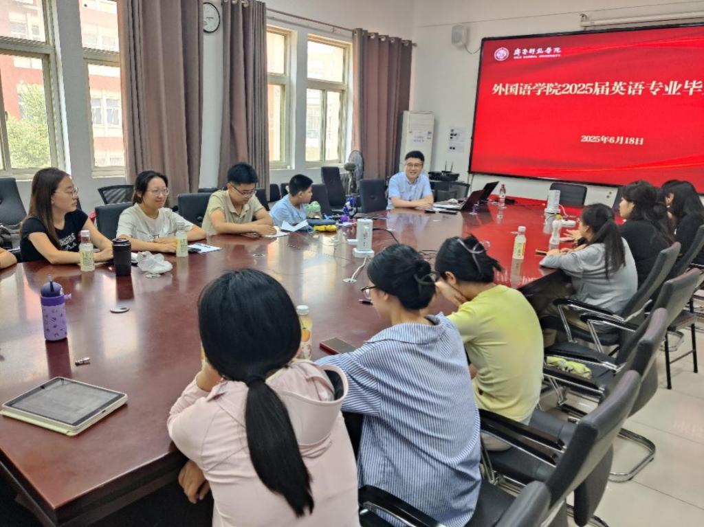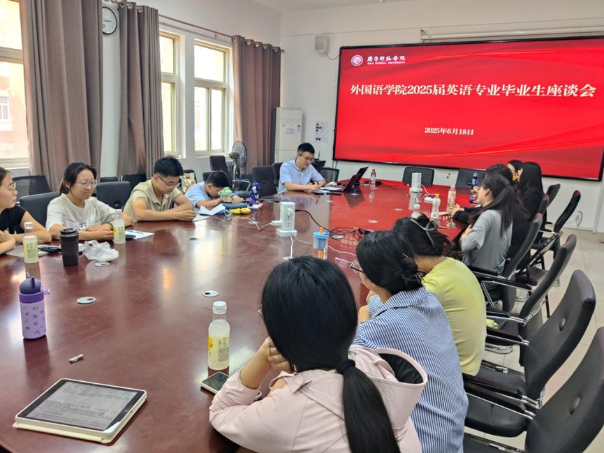 为了深入了解毕业生对专业课程设置、实践环节、能力培养、支持服务等方面的真实感受和评价,收集同学们对专业人才培养方案、教学实施、实习实践等环节的具体、可操作的意见和建议,6月18日下午,外国语学院组织召开了2025届英语专业毕业生座谈会,会议采取线上线下相结合方式组织开展,由英语专业教研室主任林德奖、英语教育教研室主任张力文主持。