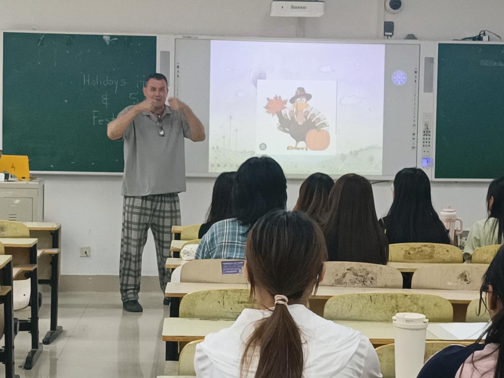活动伊始,外教老师以幽默的自我介绍开场,迅速拉近了与同学们的距离。他鼓励每位同学站起来,用英语介绍自己的姓名、专业和家乡。同学们踊跃参与,纷纷分享家乡的风土人情、特色美食和人文景观。在这一环节中,大家不仅锻炼了英语表达能力,也更加了解了彼此的文化背景。随后,外教师围绕“Festivals”展开讲解。他一边介绍包括春节、圣诞节、万圣节、感恩节等不同国家的重要节日,一边用简笔画形象描绘圣诞树、南瓜灯等节日元素,并通过互动问答帮助同学们掌握相关词汇与表达。大家还就“Which holiday do you celebrate with your family?”等话题展开小组讨论,现场气氛热烈。