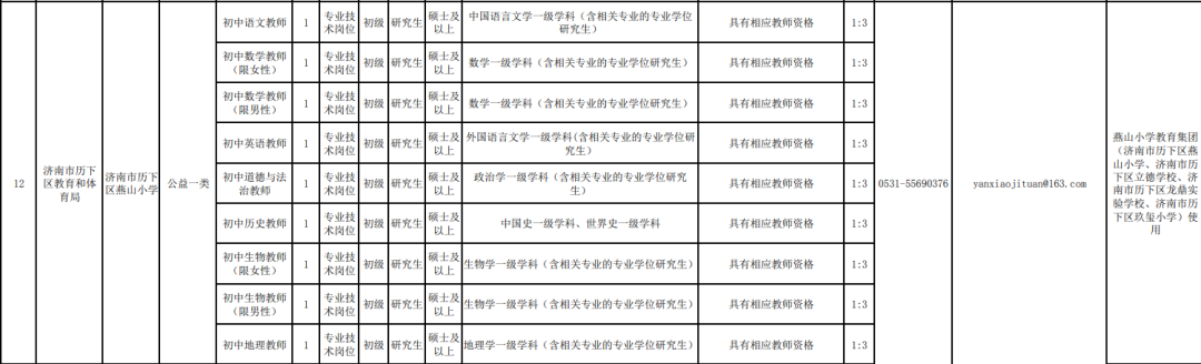 本次招聘为济南市历下区龙鼎实验学校、济南市历下区立德学校,初中部招聘9名教师,招聘岗位如下:
