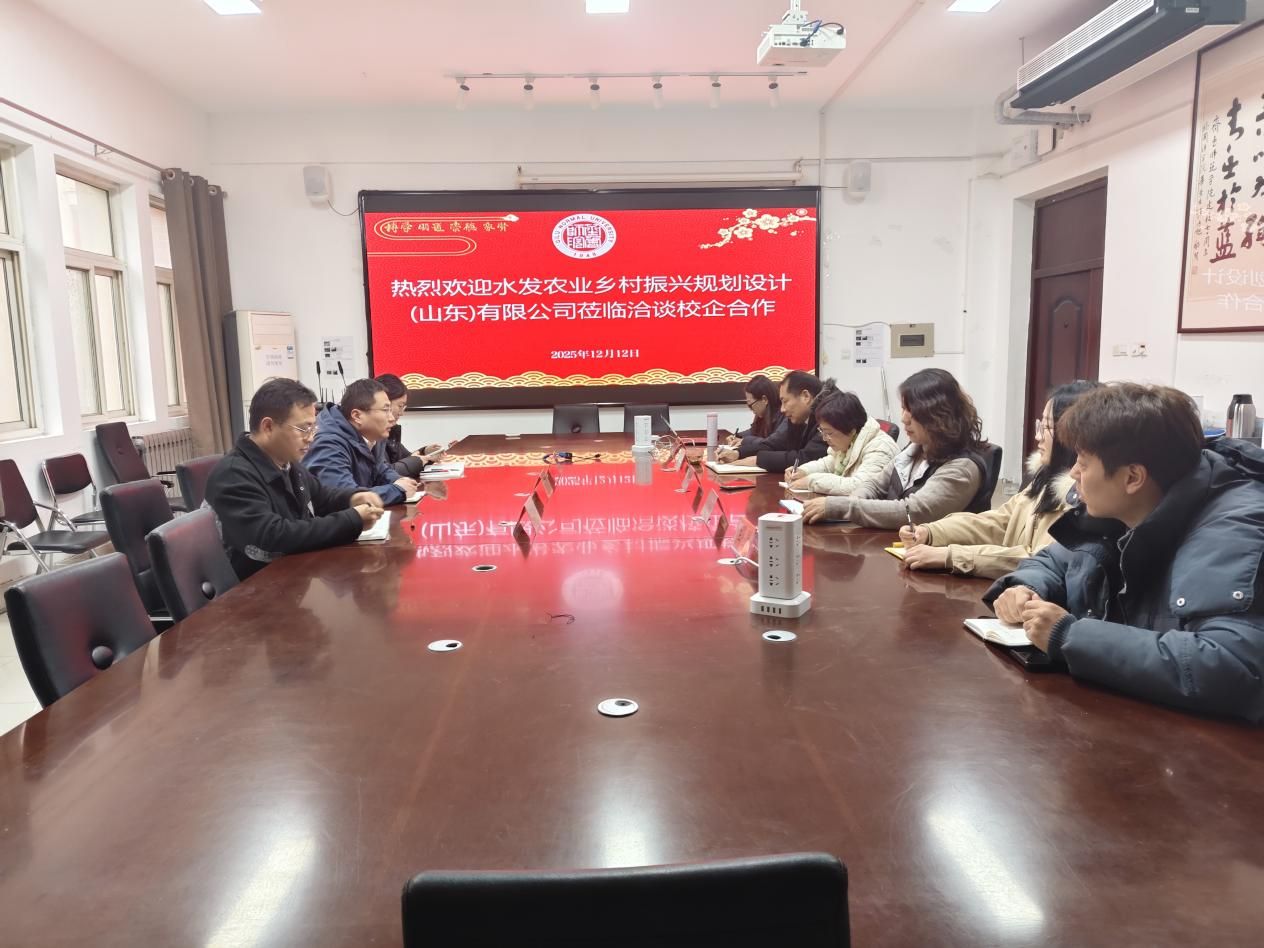 为深入贯彻落实产教融合、校企合作育人理念,精准对接乡村振兴战略下农业产业人才需求,扎实推进访企拓岗专项行动,2025年12月12日,水发农业乡村振兴规划设计(山东)有限公司总经理助理、电商业务部负责人陶俊东,电商业务部助理侯长林,及电商业务部主管、2024届外国语学院商务英语专业校友焦淼淼一行莅临学院,围绕学生实习就业、电商直播实践等核心议题开展校企合作洽谈。学院院长宋秀葵、副院长谢士金、党委副书记迟英娟、团总支书记牛荦、商务英语教研室主任石磊及专业教师王世秀热情接待并出席座谈会。