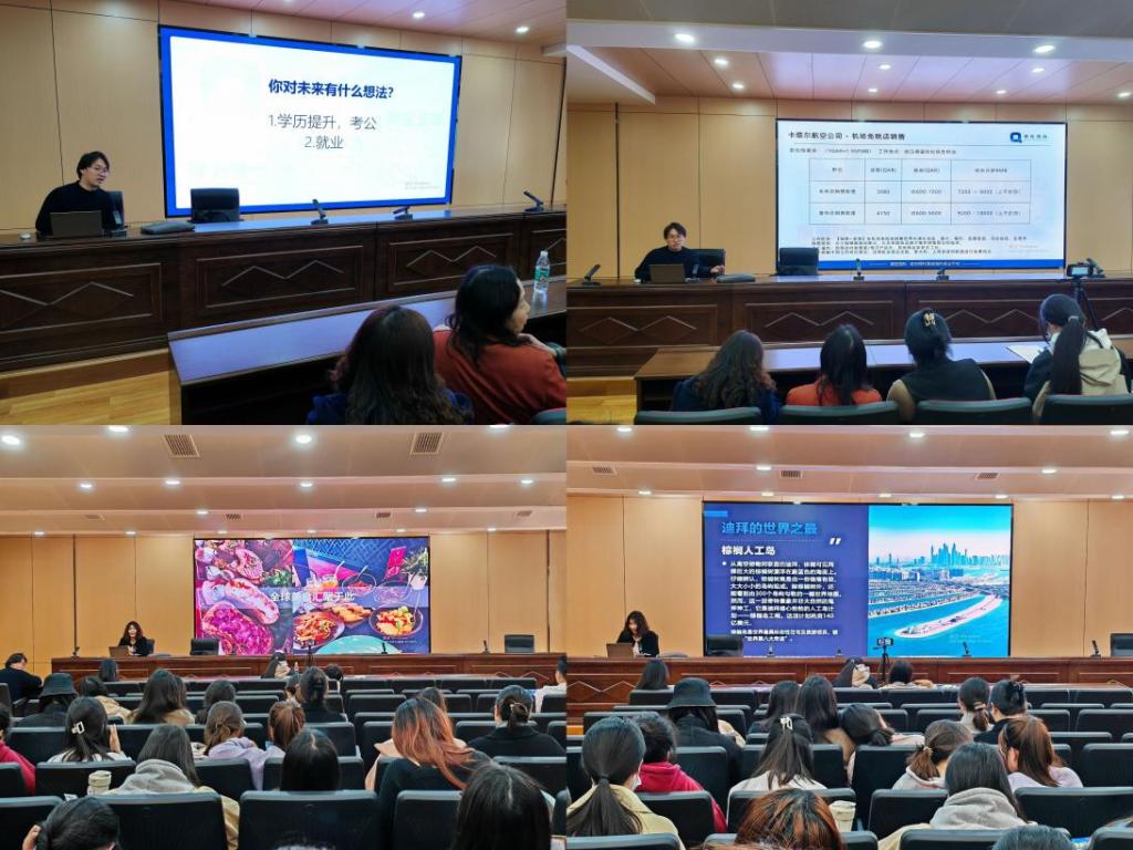 为了给在校学生展示全新的国际化视野,展示海外就业及留学之路,3月22日,外国语学院携手携程教育,举办了一场别开生面的专场校园招聘会。清宜国际的岳彩斐老师,以其丰富的国际视野和专业的教育背景,为在座的学子们带来了一场主题为“释放你的全球潜力——带‘薪’看世界,赚钱去留学”的精彩宣讲。