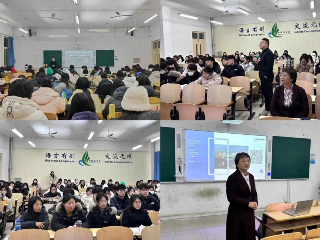 为帮助我院学生了解出国留学相关信息,提升学生的跨国文化交流和学习能力,1月3日晚18:30,外国语学院在二教A113开展了“齐鲁师范学院与英国坎特伯雷大学出国项目”宣讲会。宣讲会由外国语学院院长宋秀葵主持,坎特伯雷大学山东办公室主任张素峰主讲,外国语学院2021级商本和翻译班,2023级升本班全体同学在会场进行听讲,宣讲会全程通过腾讯会议直播。