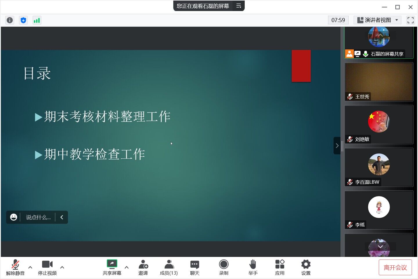 会上,石磊首先对期末考核材料整理工作做了详细讲解,包括教学大纲、试卷、合理性审批表、目标达成度表等材料的填写规范;布置了期中教学检查工作,并从课程育人、教学目标、教学组织与实施、教学效果几个方面带领全体外聘教师学习了教师课堂教学质量评价标准,着重强调了上课教学资料的准备、课堂教学规范、线上线下同步教学、试卷出题与归档、授课记录等重要工作。