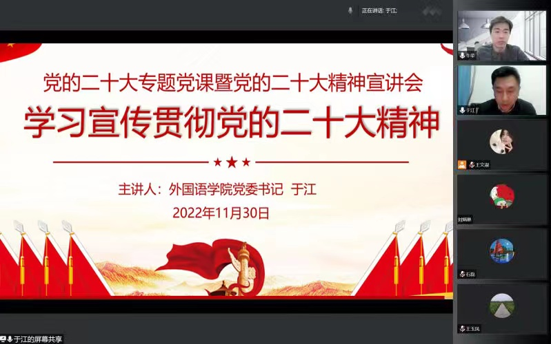 为深入学习宣传贯彻党的二十大精神,迅速在学院掀起学习热潮,11月30日晚,外国语学院党委书记于江通过线上线下相结合的方式为学院全体师生党员和入党积极分子共约三百余人上了一堂党的二十大专题党课,并就学院学习贯彻党的二十大精神提出工作要求。