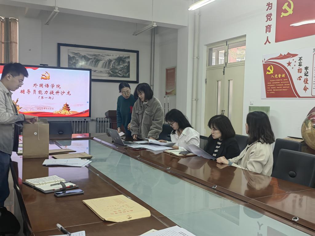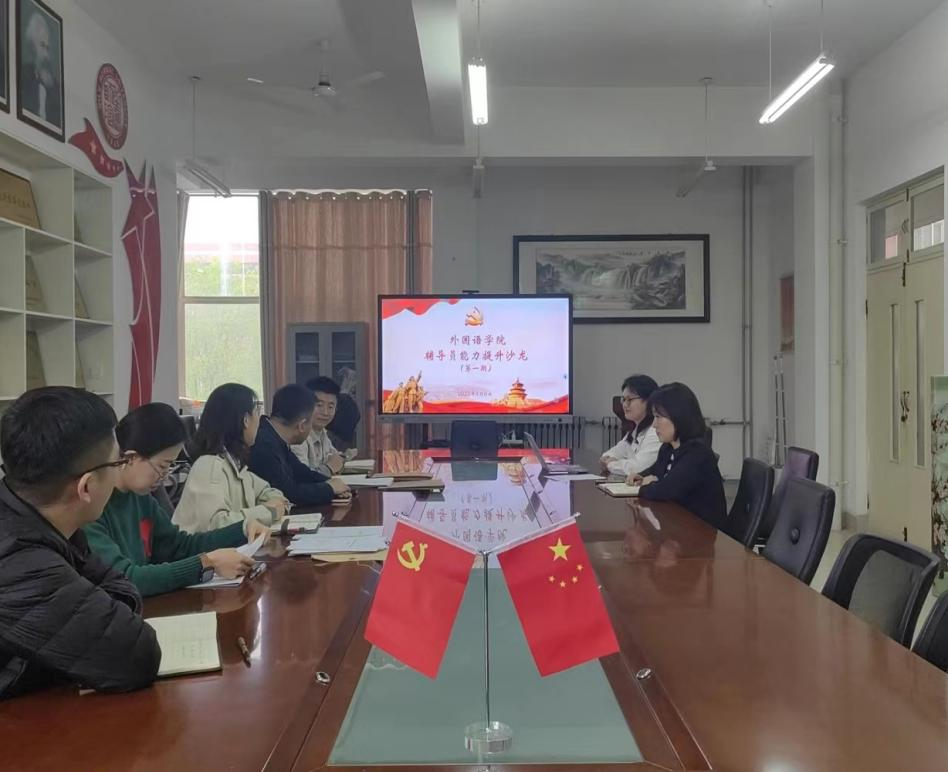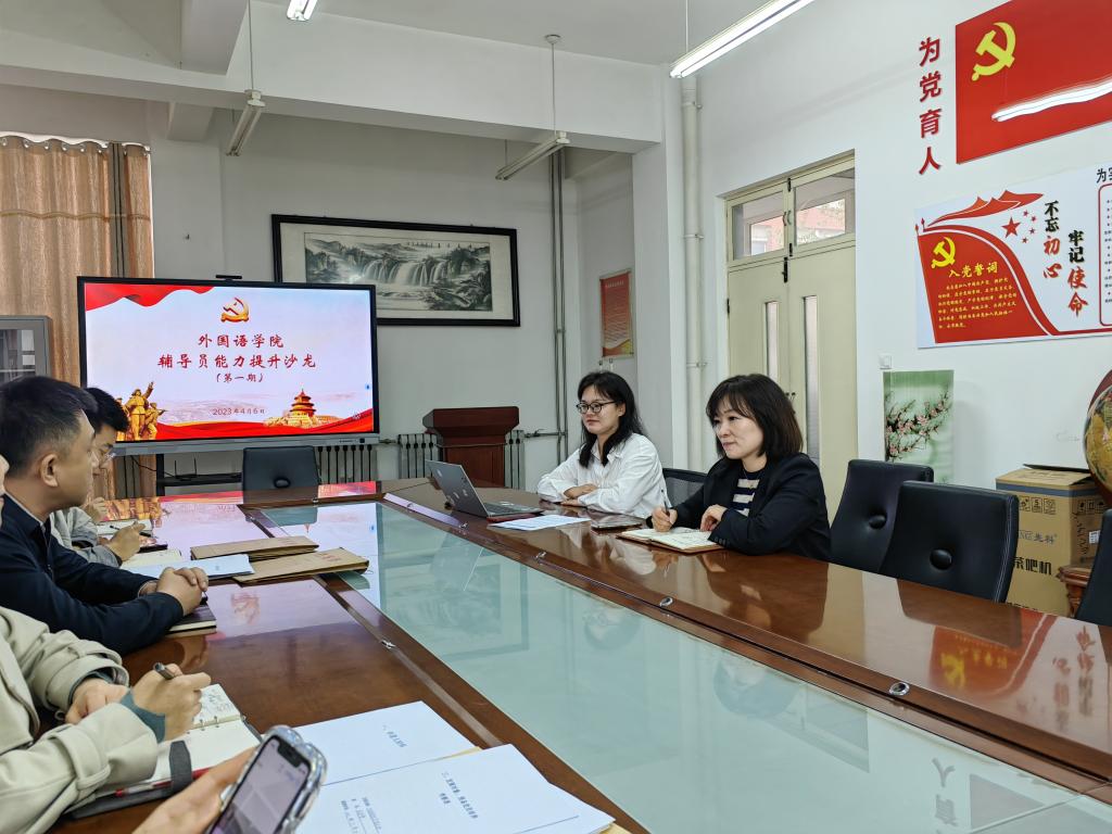 为深入学习宣传贯彻党的二十大精神,切实加强辅导员队伍建设,搭建辅导员学习交流平台,2023年4月6号上午,外国语学院成功举办第一期辅导员工作能力提升沙龙,本期沙龙的主题是“如何做好新形势下的党员发展工作”。沙龙邀请了马克思学院党委副书记毛雯、团总支书记王雅文进行分享交流,学院党委书记于江、党委副书记迟英娟及全体辅导员参加,沙龙由迟英娟主持。