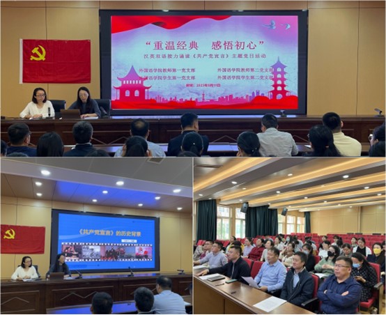 “A specter is haunting Europe — the specter of communism.”“一个幽灵,共产主义的幽灵,在欧洲游荡……”,为深入学习贯彻习近平新时代中国特色社会主义思想教育主题工作,坚定广大党员的理想信念,增强思想凝聚力,加强青年党性修养,强化责任担当,从党的百年奋斗历史经验中汲取智慧和力量,5月11日下午,外国语学院教师第一、二党支部联合学生第一、二党支部在二教A111报告厅共同举办以“重温经典,感悟初心”为主题的接力诵读《共产党宣言》(英文版)主题党日活动,活动由教师第二党支部书记张力文主持。
