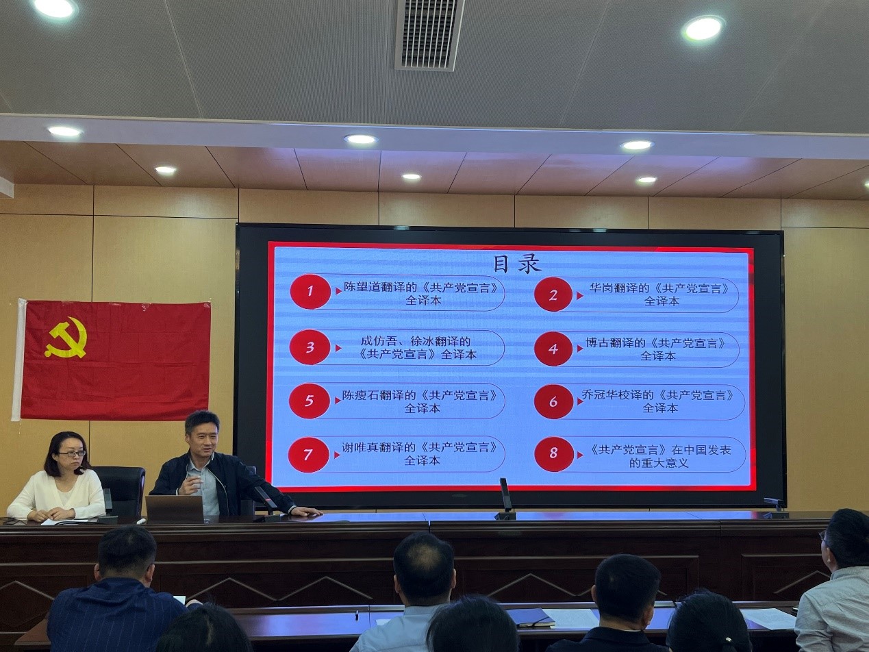 教师第一党支部翻译教研室党小组负责人李百温介绍了我国不同历史时期对《共产党宣言》的不同翻译版本的具体情况以及背后鲜为人知的故事,并结合专业知识,分析了各版本的译介情况。从陈望道翻译的《共产党宣言》第一个全译本开始到之后的7个中译本,《共产党宣言》中文全译本问世了百年,从翻译片断到全文,从秘密出版到公开发行,从伪装本、手抄本到纪念版、珍藏版,《共产党宣言》的不同中译本,不仅影响了孙中山、毛泽东、邓小平等历史伟人,更见证了中华民族百年来的屈辱与奋起,以及中国共产党人坚持不懈追求真理的初心,见证了马克思主义中国化的历史进程。