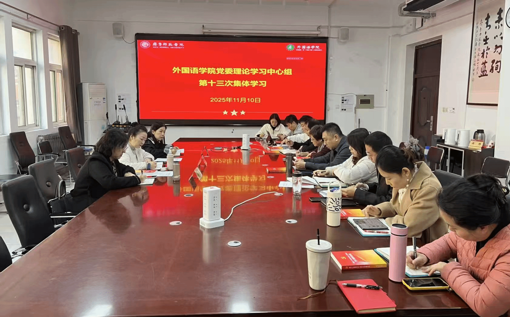 11月10日,外国语学院党委理论学习中心组进行本年度第十三次集体学习(扩大)会议,集中学习贯彻党的二十届四中全会精神。学院党委理论学习中心组全体成员参加学习,学院院长宋秀葵、副院长邹德平,以及全体行政人员列席参加学习。学校党委第二巡查组组长马艳、副组长赵晶磊和成员高超列席指导。会议由学院党委书记于江主持。