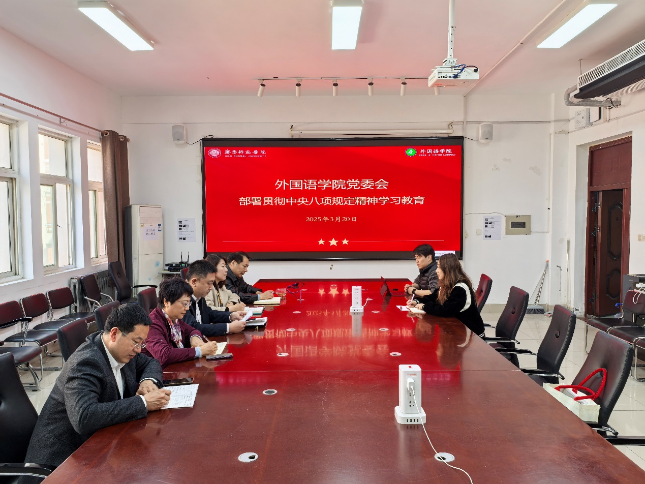根据学校有关会议精神要求,3月20日下午,外国语学院党委召开党委会,学习贯彻习近平总书记关于深入贯彻中央八项规定精神学习教育的重要讲话重要指示精神,研究部署开展贯彻中央八项规定精神学习教育工作。外国语学院党委委员参加会议,学院院长宋秀葵列席参加。会议由学院党委书记于江主持。