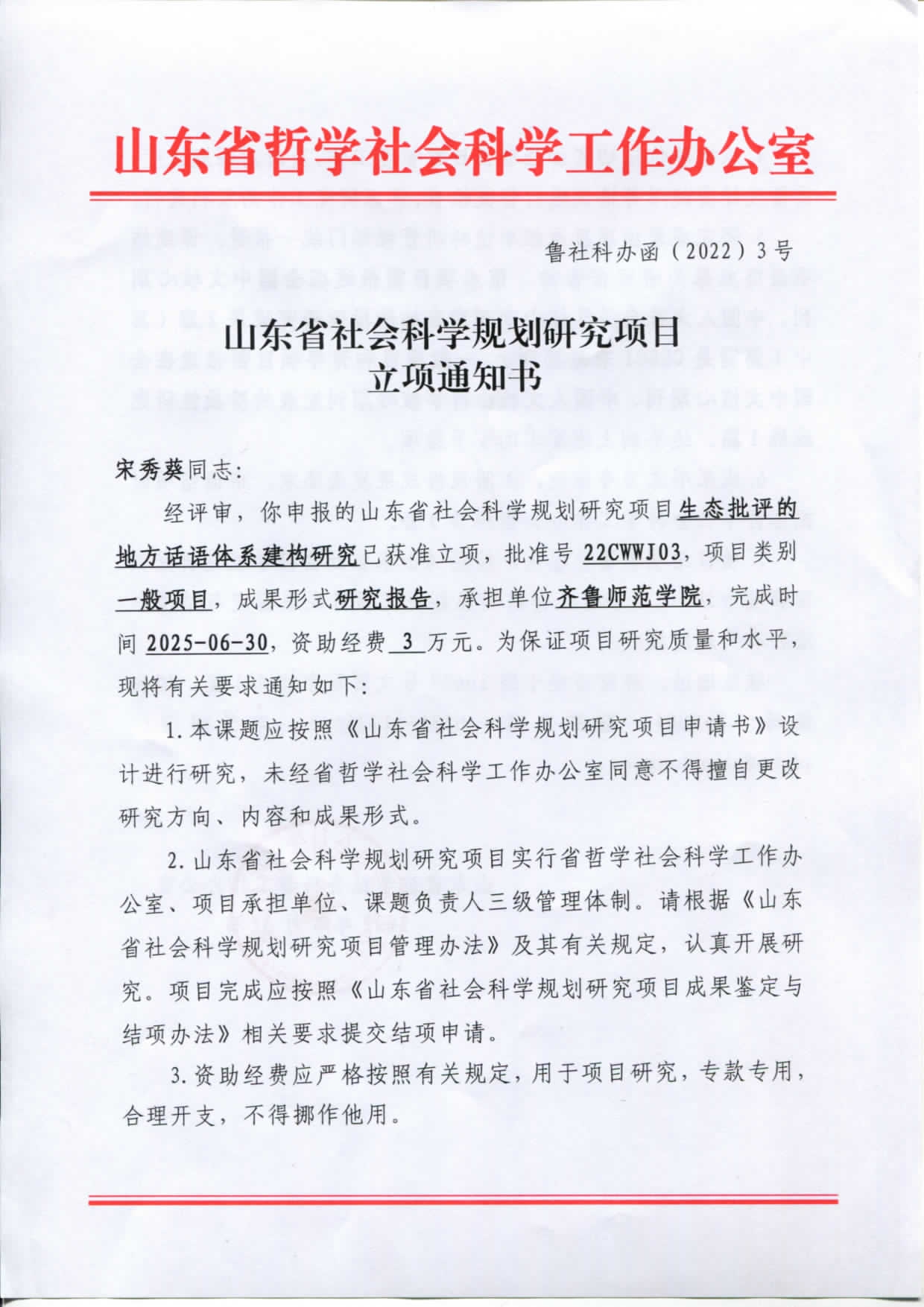 宋秀葵-山东省社会科学规划研究项目立项通知书
