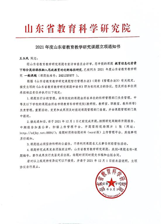王玉凤2021-山东省教育科学研究立项