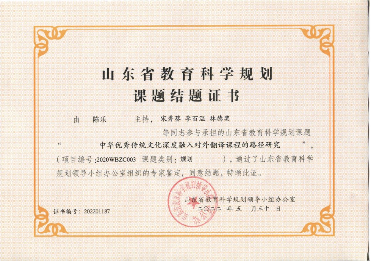 陈乐-“中华优秀传统文化深度融入对外翻译课程的路径研究”结题证书