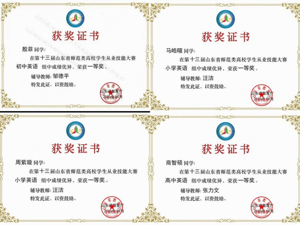 外国语学院始终将师范生实践能力提升作为人才培养核心抓手,在第十三届山东省师范类高校学生从业技能大赛中斩获历史最佳成绩。入围决赛的10名参赛选手凭借过硬专业素养与扎实教学功底脱颖而出,最终拿下4项一等奖、4项二等奖、1项三等奖,创下学院参赛以来的最好成绩,充分彰显了学院人才培养的扎实成效。在全省参赛高校中,我院英语学科名列前茅,一二等奖获奖总数在参赛高校中排名第一,一等奖仅次于山东师范大学,成为最具竞争力的院校之一。