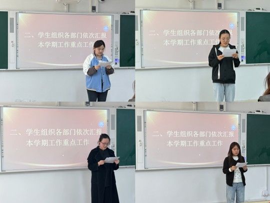 随后,外国语学院学生会、自律会、新媒体中心及青年志愿者协会负责人依次上台述职。各负责人全面总结过往工作成效,深刻剖析现存问题短板,科学谋划未来发展方向。其中,学生会聚焦学风建设,以学术竞赛为突破口激发学子科研热情,借文体活动营造积极学习氛围,并优化综合测评体系,为学风提升筑牢根基;自律会紧抓课堂纪律,通过常态化巡查与动态化管理,筑牢学风建设第一道防线;新媒体中心整合图文、视频等宣传资源,多维度传播学院动态,增强学院品牌影响力;外国语学院青年志愿者协会深耕志愿服务、社区支教及双创平台搭建,拓展学生实践渠道,助力全面发展。